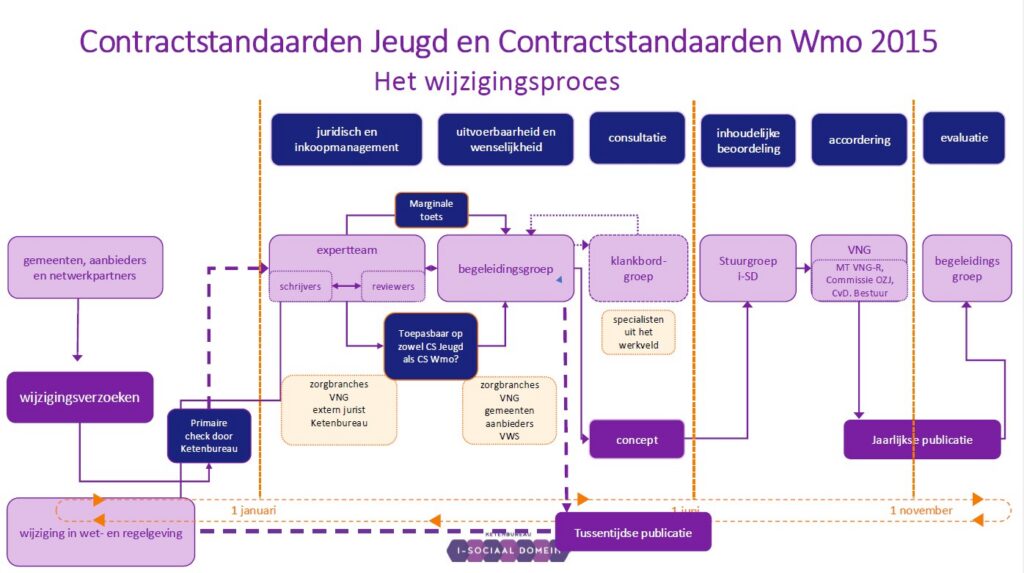 Gemeenten en aanbieders lopen in de praktijk soms tegen bepalingen aan die niet scherp genoeg zijn of lastig uitvoerbaar zijn. Hiervoor heeft het Ketenbureau i-Sociaal Domein een jaarlijks wijzigingsproces van de standaarden ingericht. Een begeleidingsgroep (vertegenwoordigers van VNG, VWS, gemeenten en aanbieders) en een expertteam bestaande uit juristen beoordeelt de ingediende voorstellen op juridische en pragmatische uitvoerbaarheid.